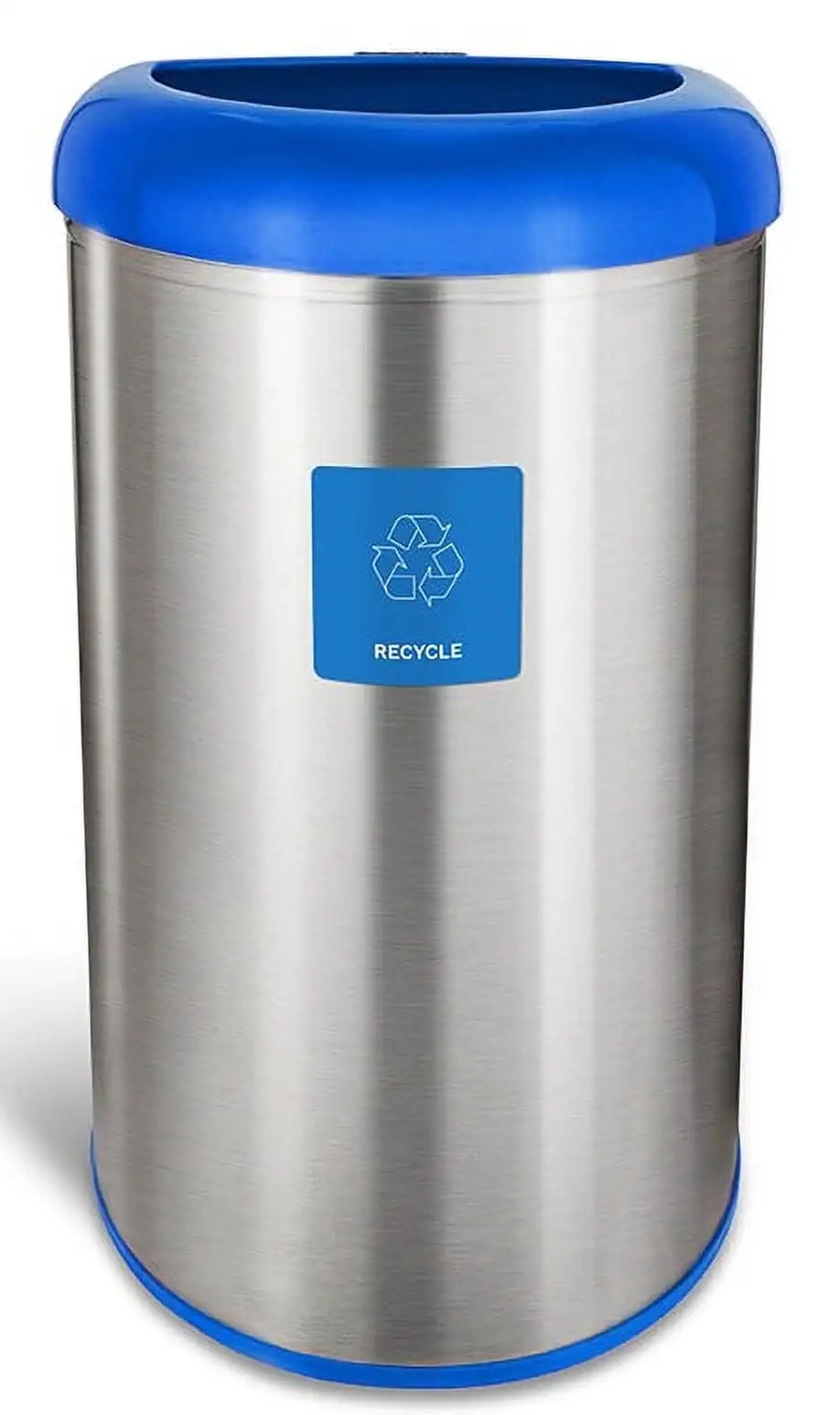 Nine Stars stainless steel 13.2 GAL / 50 L open top trash can with blue trim and "RECYCLE" magnet included is ideal for the kitchen or office break room. Fingerprint-resistant stainless steel makes clean-up a breeze and non-skid base keep can in place. Ring liner holds and conceals the bag within the outer can resulting in no unsightly trash bag overhang!