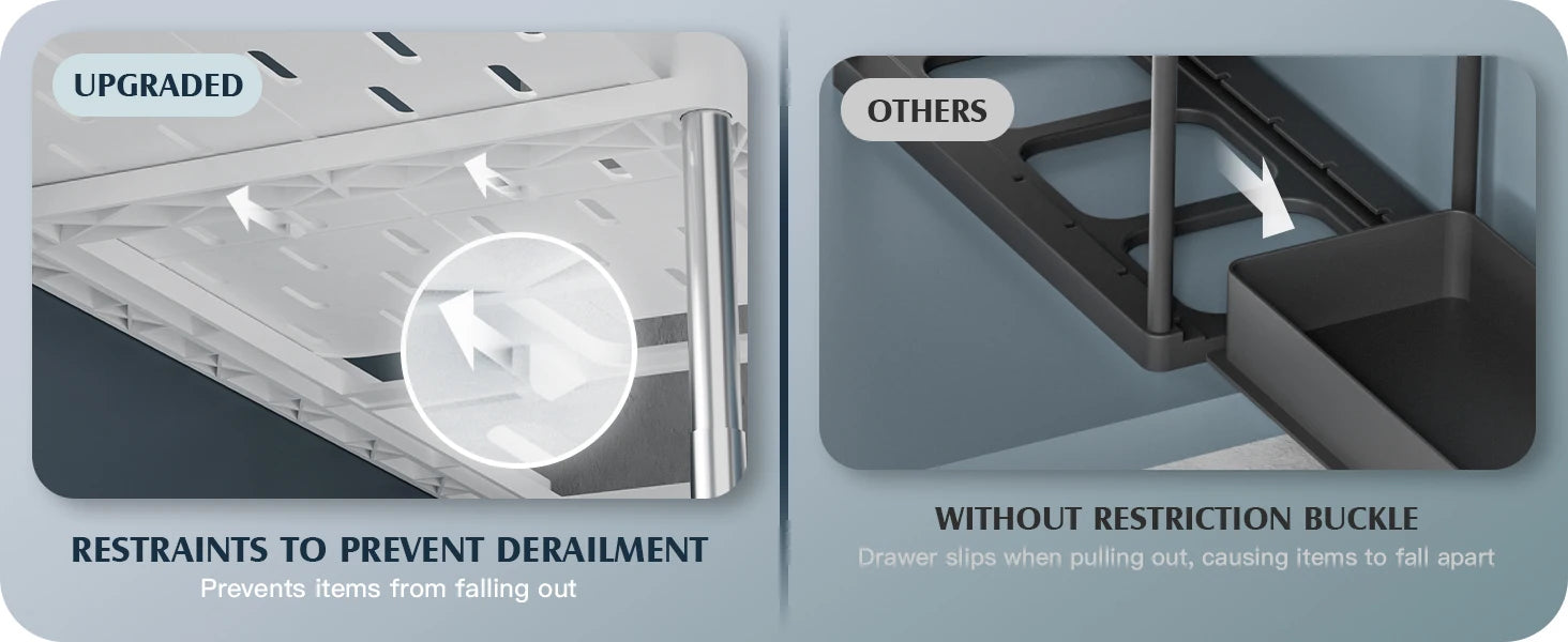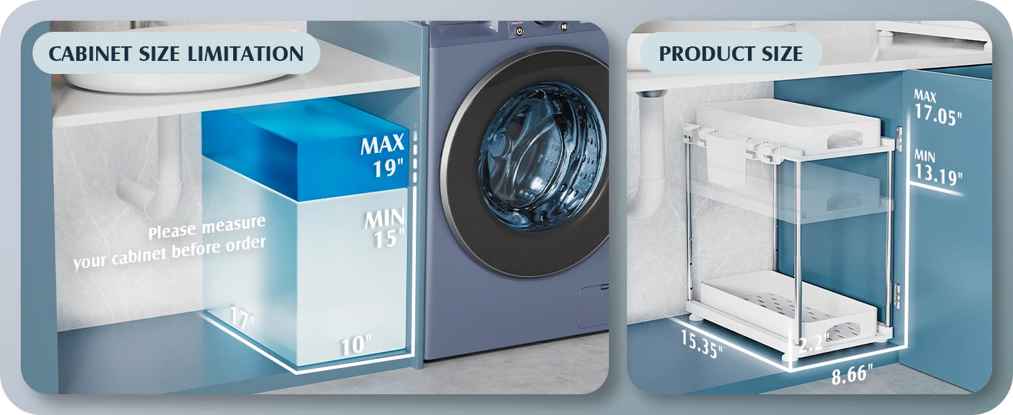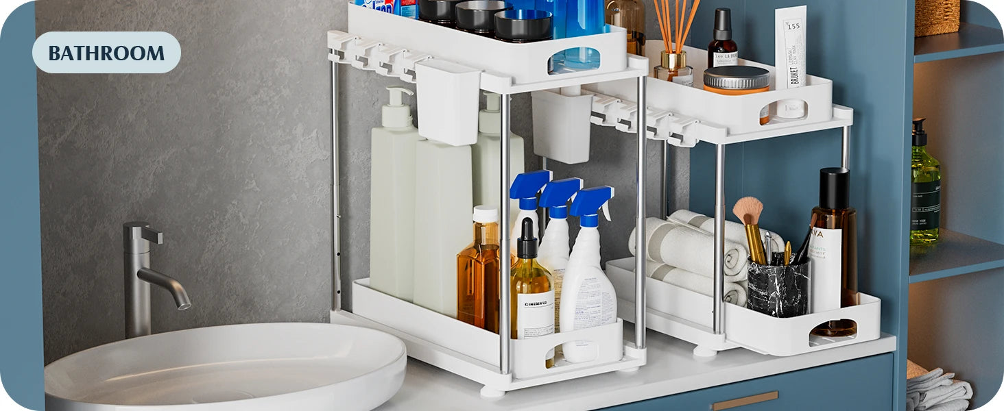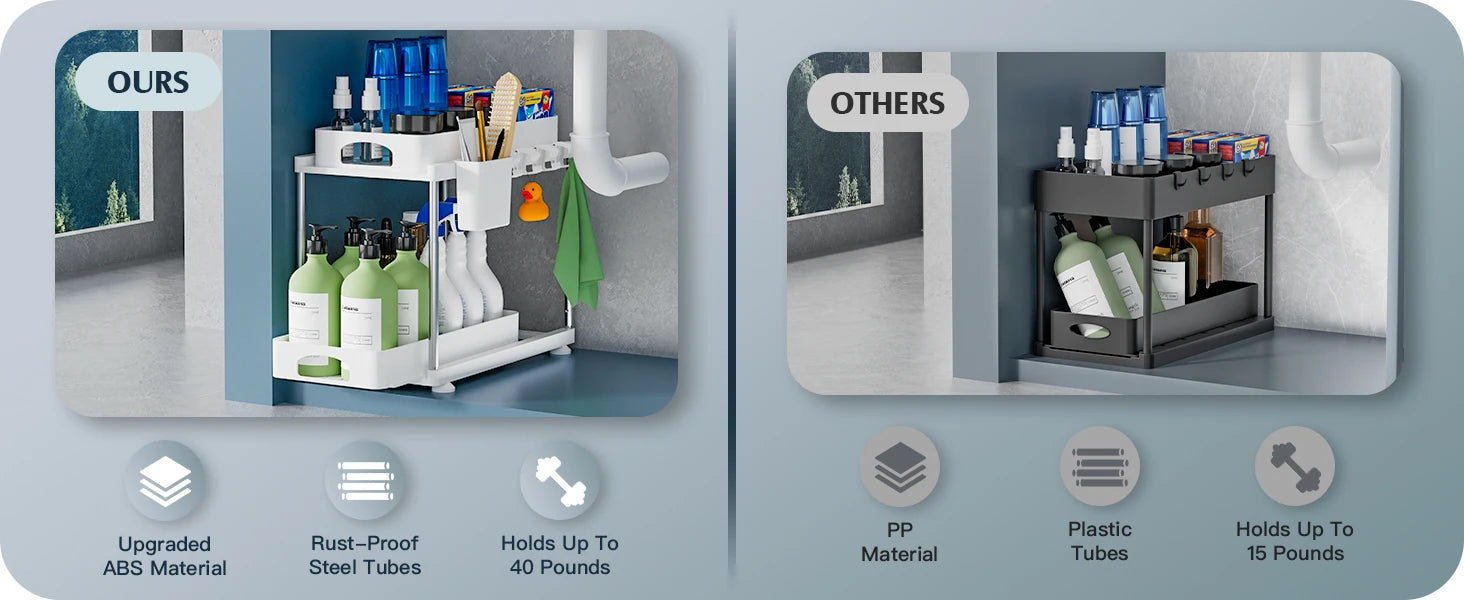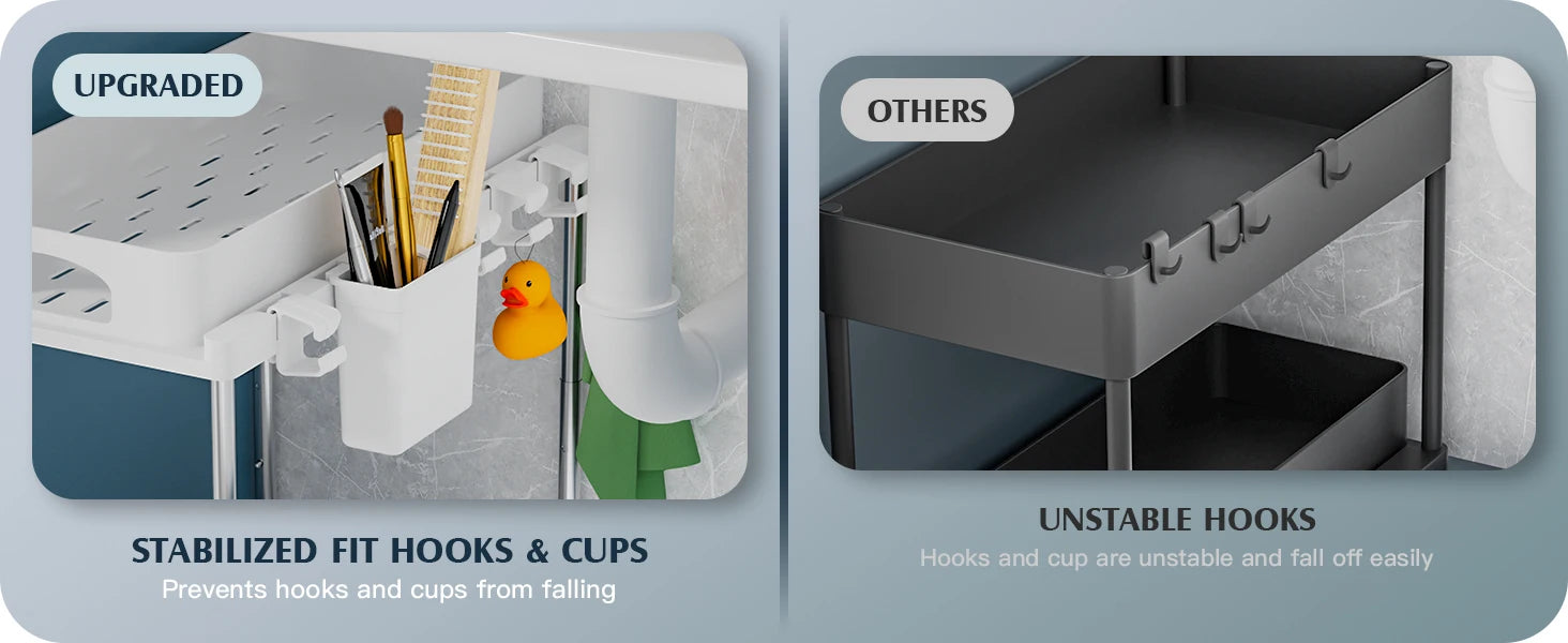 - Easy To Assemble and Clean:No need to prepare any additional tools, you can easily assemble the under cabinet storage by following the steps in the instructions. The bathroom cabinet storage and hanging cups with hollow design can effectively prevent water accumulation, which can be also kept clean by wiping with a damp cloth.