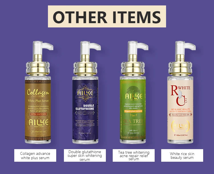 Discover the secret to radiant skin with the AILKE Brightening Face & Body Whitening Serum. This luxurious 100ML serum is expertly formulated to help you achieve a clean, blemish-free complexion with the power of natural ingredients. Infused with Glutathione, Aloe Vera, and Vitamin C, this serum not only lightens dark spots but also enhances your overall skin tone.