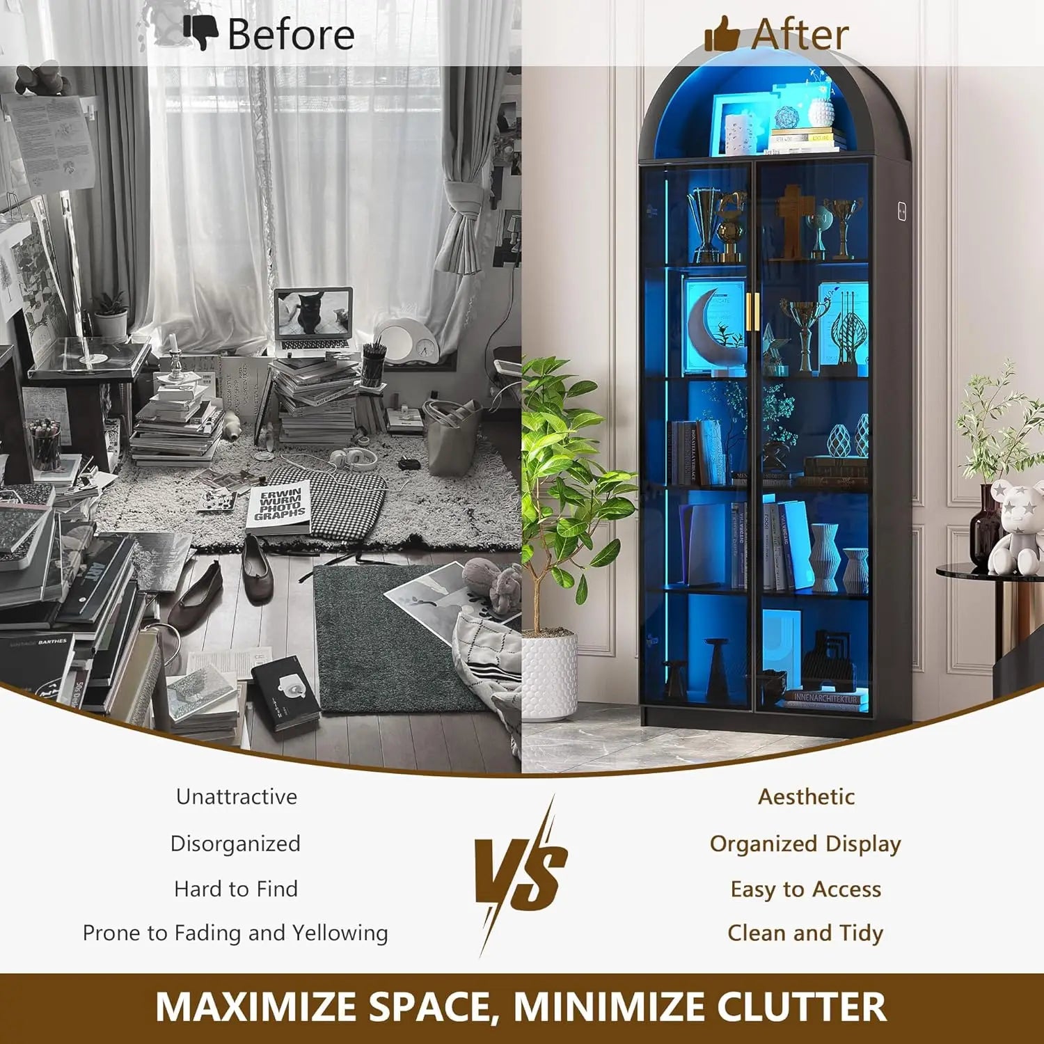 Display Cabinet with Doors and Adjustable Shelves, 76" Tall Display Case with LED Lights/Arch Storage Space