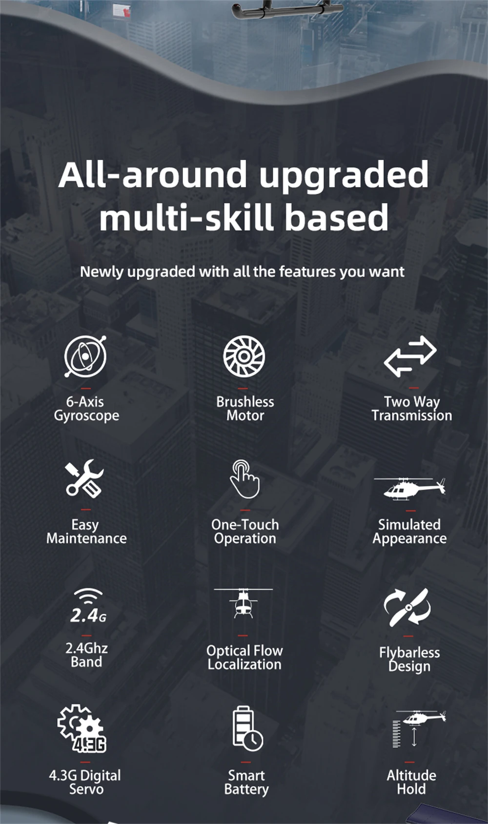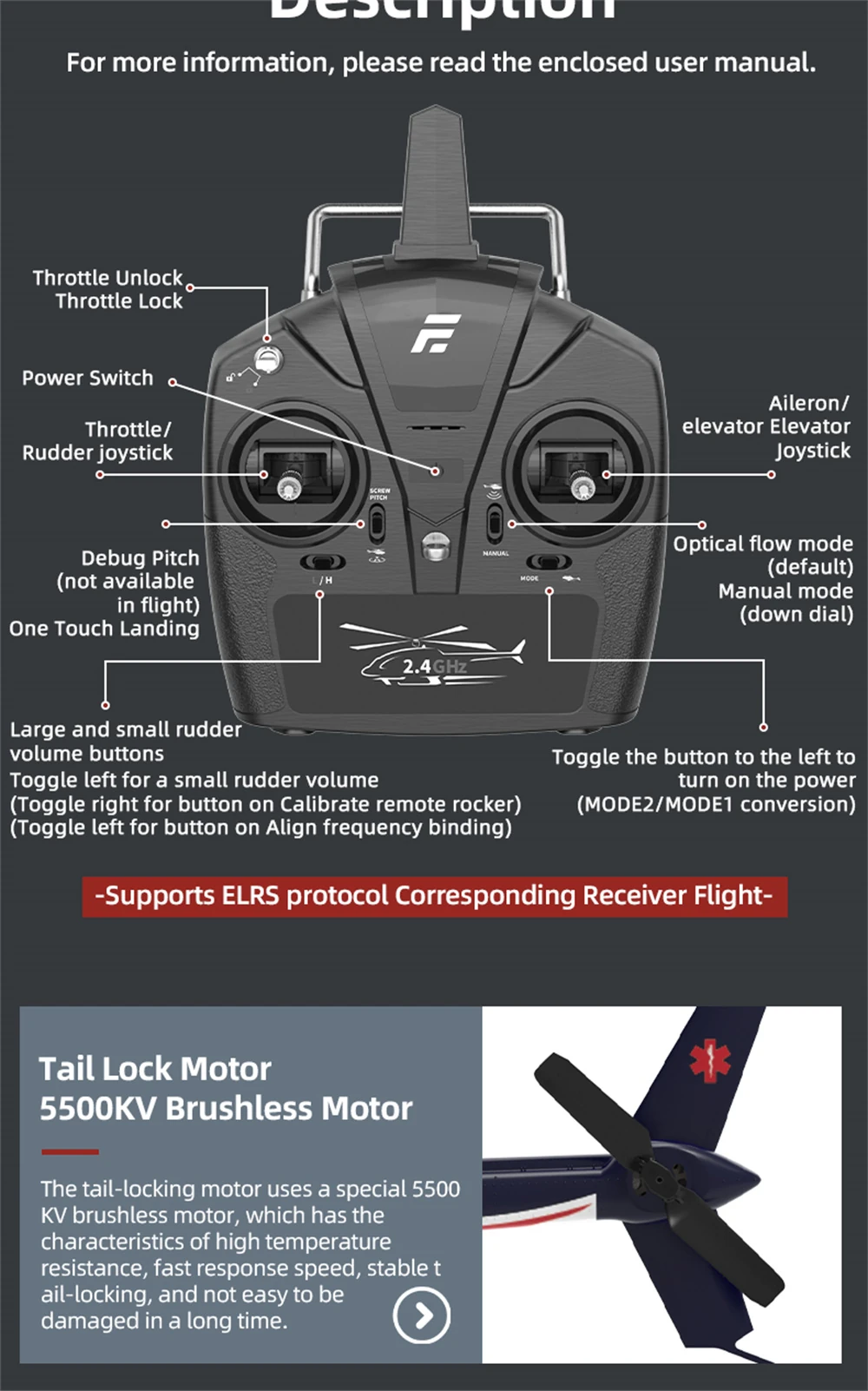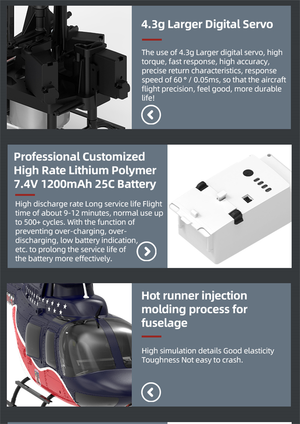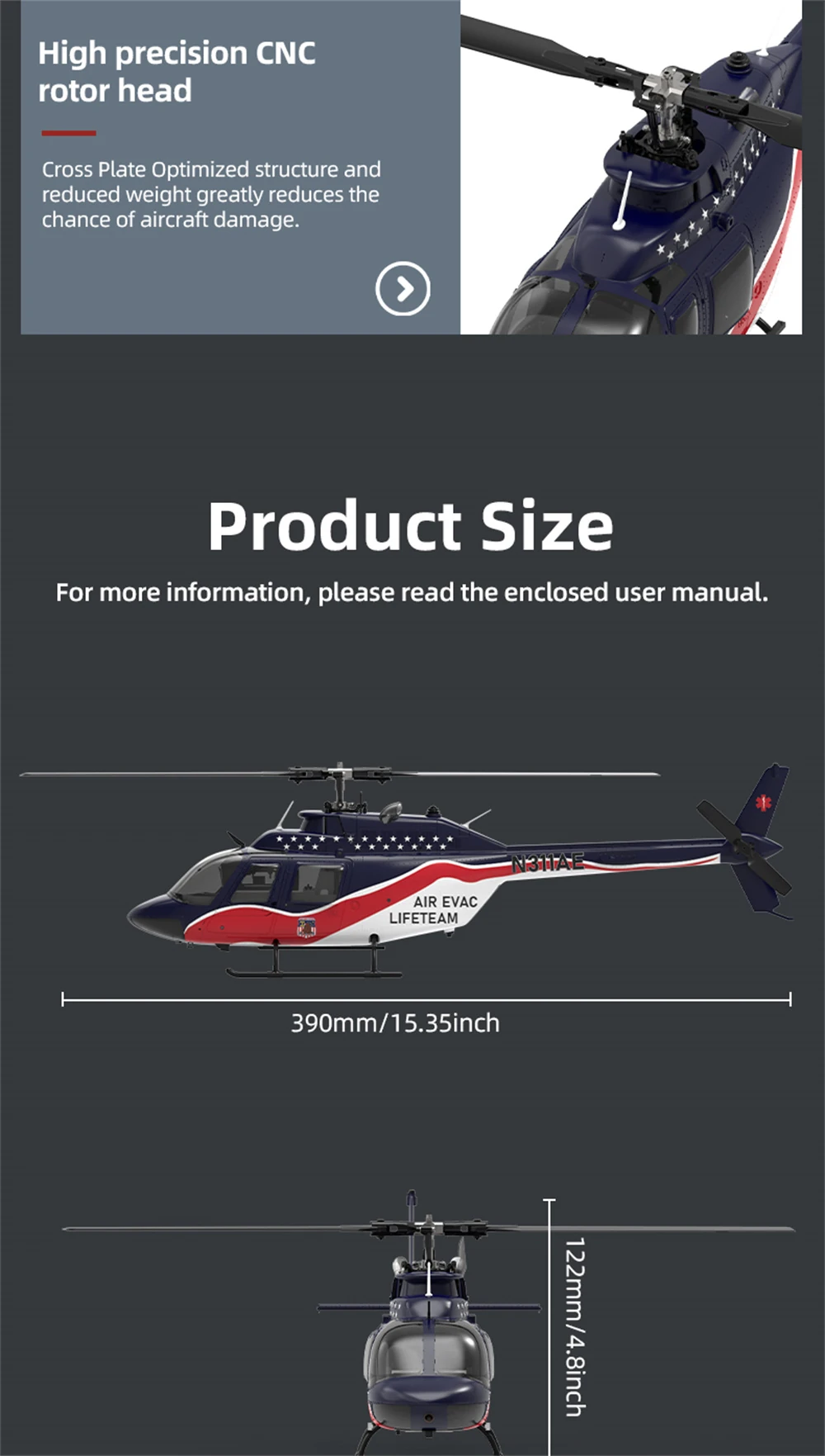 2> It adopts flybarless design, dual-axis co-drive motor, electronic stabilization system, more precise feel, more stable flight, optimized structure to reduce the chance of damage.