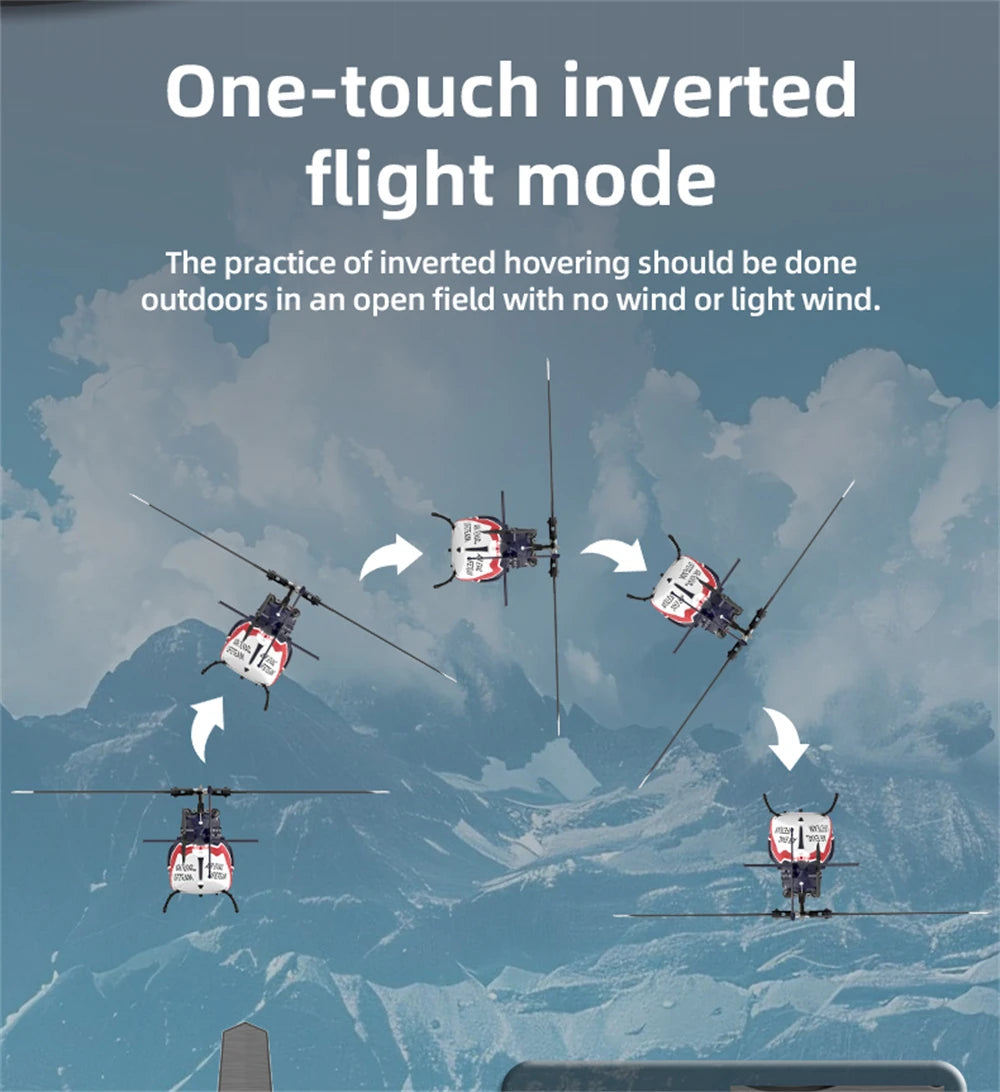9> Intelligent high-altitude one-button inverted flight, the inverted flight mode is operated in the same way as the forward flight mode, and beginners can easily master the inverted flight control essentials and become familiar with direction control.