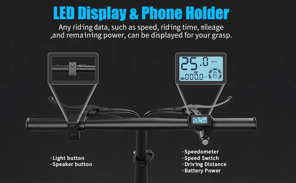 [๐๐๐ง๐จ๐ค๐ฃ๐๐ก๐๐ฏ๐๐ ๐พ๐ฎ๐๐ก๐๐ฃ๐] Ebike for adults equipped with an colorful LCD, which enables you to track your riding data effortlessly such as current speed, single ride mileage, total ride mileage, etc. You can customize the number of levels and the corresponding speed through the display. And it has 3 riding modes: pure electric, pedal assist and ordinary bicycle. You can choose your travel mode according to your own situation or preferences
