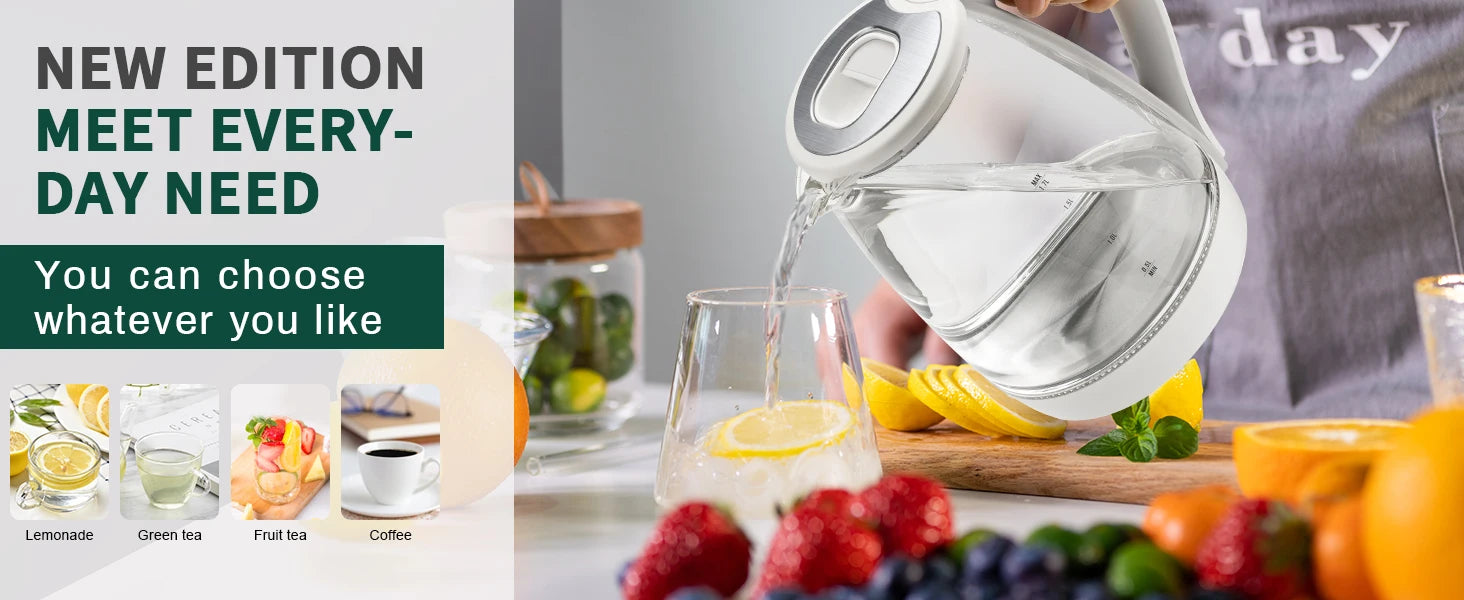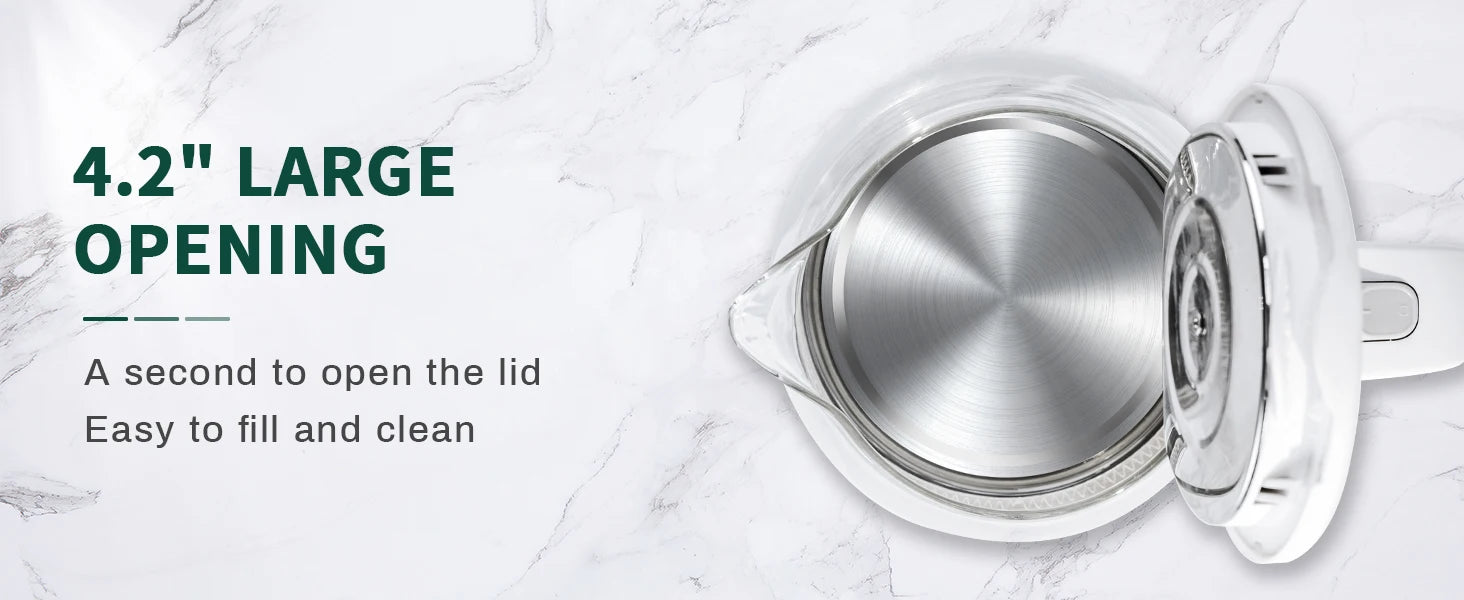 【QUALITY MATERIAL | KITCHEN ESSENTIALS】- Our water kettle electric has zero contact with plastic, the borosilicate glass body is resistant to thermal shock, and the 18/8 stainless steel inner bottom adds a sleek, modern touch and rust-resistant durability, so you can enjoy pure, safe boiling water with confidence;