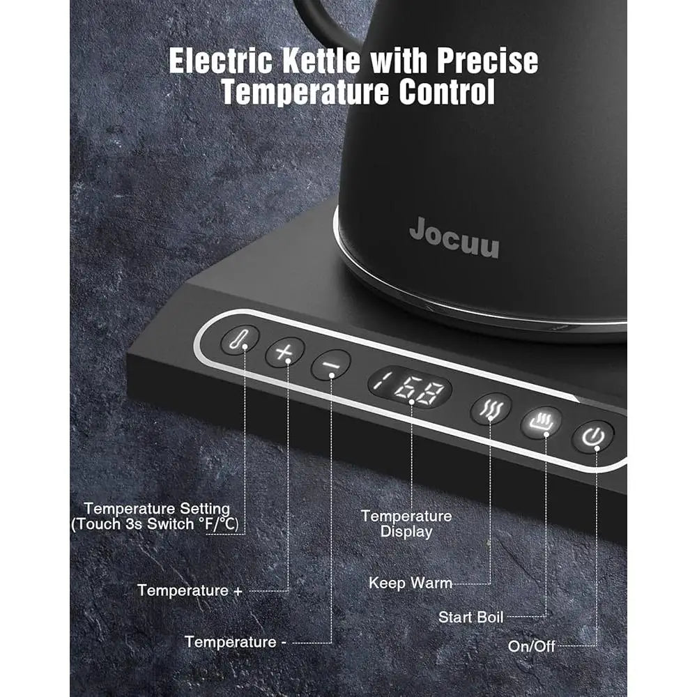 About this item Electric Kettle with Temperature Control: Brew your beverage at the temperature with Jocuu gooseneck electric kettle. Its temperature control ranges from 113°F-212°F and is adjustable by one degree for crafting your coffee or tea with precision Quick Heating and 4-Fold Safety Protection: The electric kettle operates at 1200W, boils water in 1-3 minutes, and automatically shuts off once the water reaches the set temperature. Its leak-proof design and additional safety features like the NTC temperature sensor and boil-dry function allows the tea kettle to turn off when the water in it dries out completely Keep Warm and Memory Function: Jocuu pour-over kettle lets you track the real-time temperature of your beverage on the LED panel and its Keep Warm Function maintains it for up to 120 minutes. The tea maker with memory function, remembers and maintains the preset temperature you selected last time for brewing the same taste every time Cordless Kettle with Leak-Proof Design: Designed in California, the electric kettle for boiling water features precision pours spout, designed for optimal pour-over flow rate, giving you total control over the speed and direction of the stream with no drip back. For a cordless pour, you can easily operate the water kettle with one hand by detaching it from the base Durable Performance: Rejuvenate yourself with the purest taste of every beverage, 304 stainless steel tea kettle.