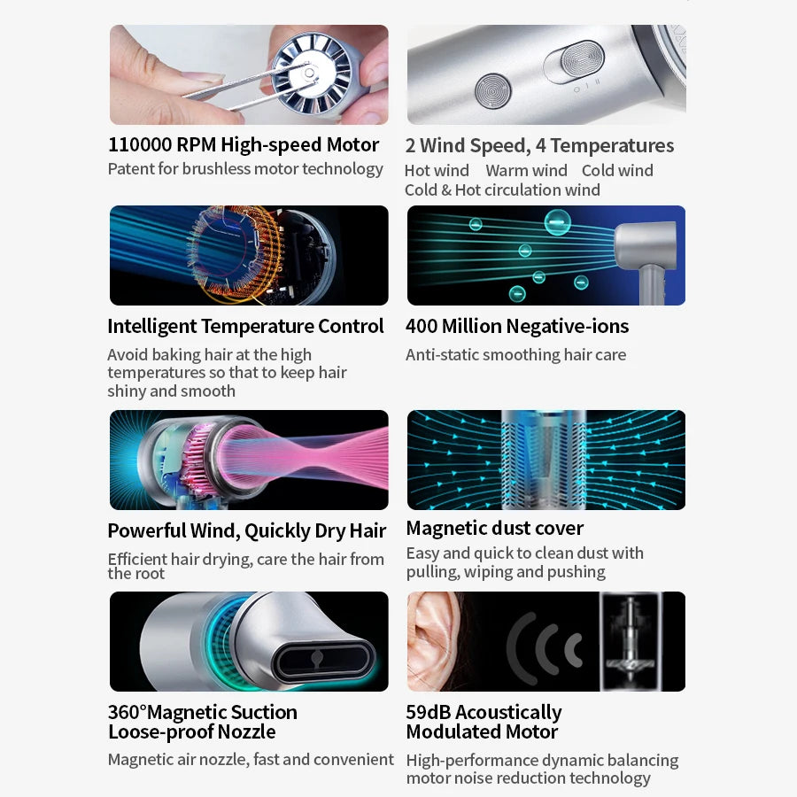 High Speed Hair Dryer 110000RPM 400 Million Negative Ionic Professional Hair Straightener Care for Home Travel Nozzle Blow Dryer