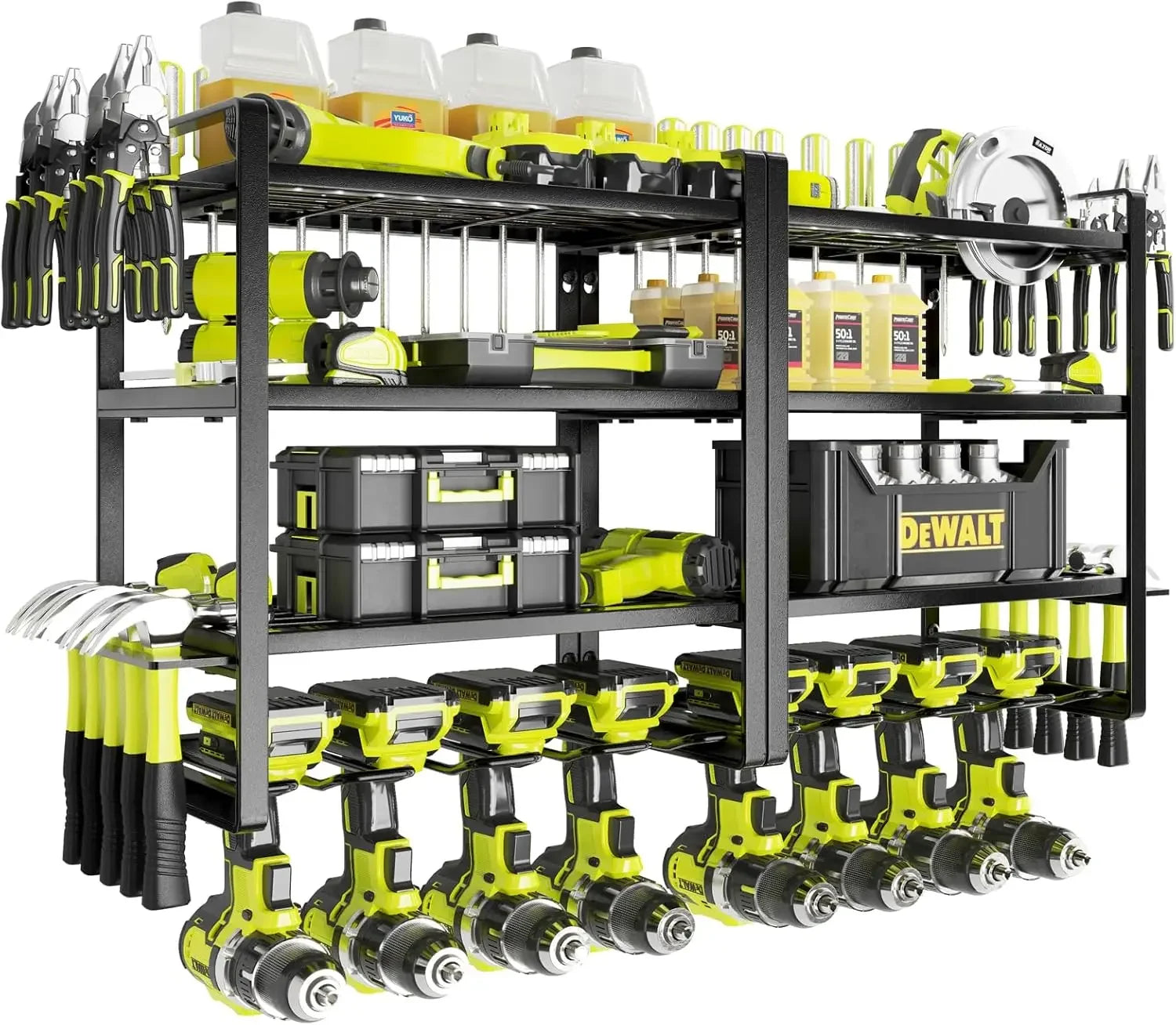 - 【4-tier High-capacity Storage】This power tool organizer uses the latest four-tier high-capacity design. The bottom layer can store 8 cordless drills, the upper three layers can store other heavy tools or various small tools, and a hammer holder, pliers holder and screwdriver holder are added to the side.